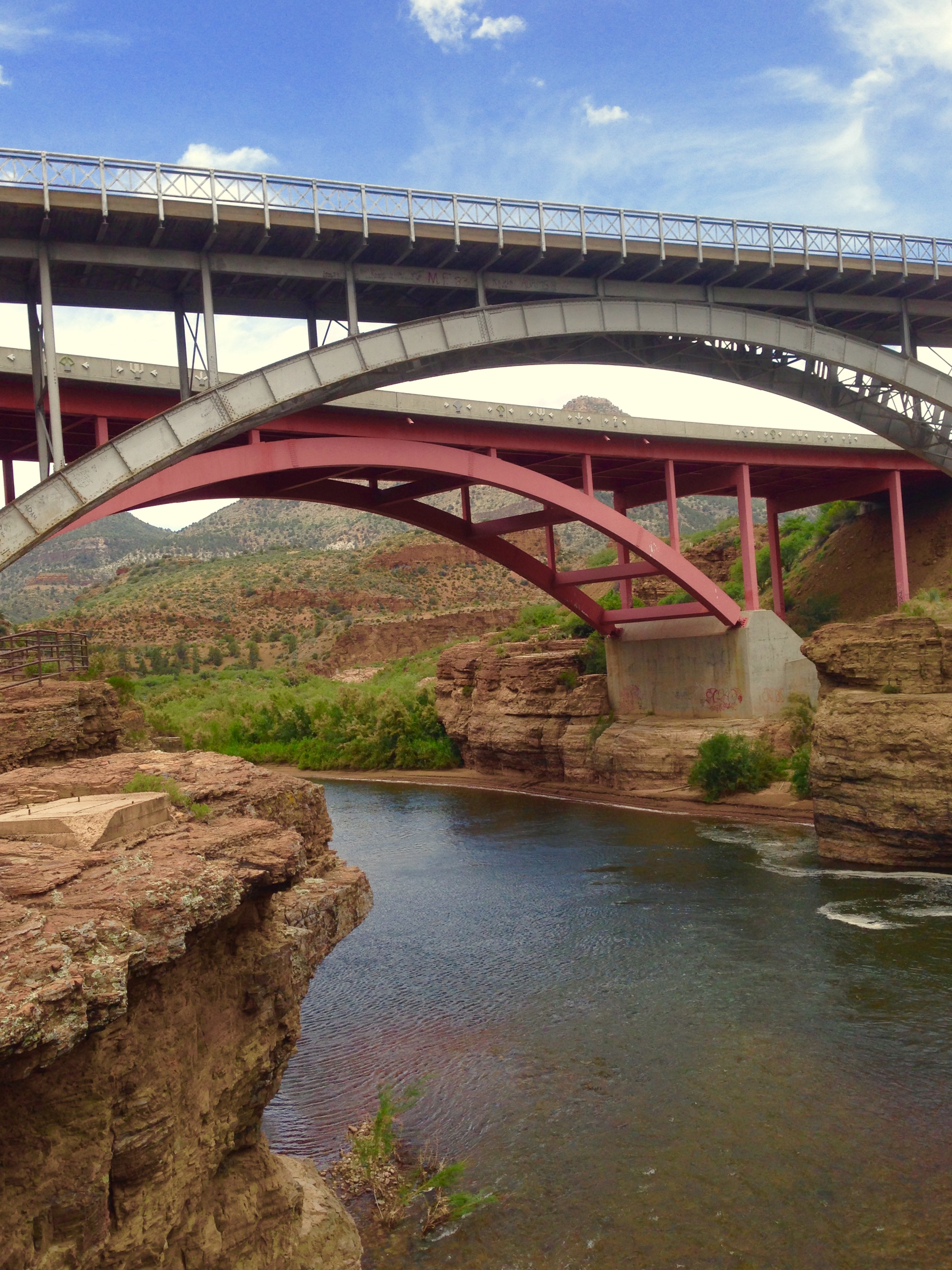 The Salt River is a 200-mile tributary of the Gila River and the canyon is an approximately 2200 foot gorge that serves as the demarcation between the White Mountain Apache and San Carlos Apache reservations. This section of Highway 60 first opened in 1938 and features dramatic hairpin turns on both sides of the canyon and amazing views (if you are the driver, it’s tempting to look while driving, but please use the pull-outs to stop safely before enjoying the view). The bridge across the Salt River was upgraded in 1993 and is adjacent to the earlier bridge, both of which are picturesque in their own right.